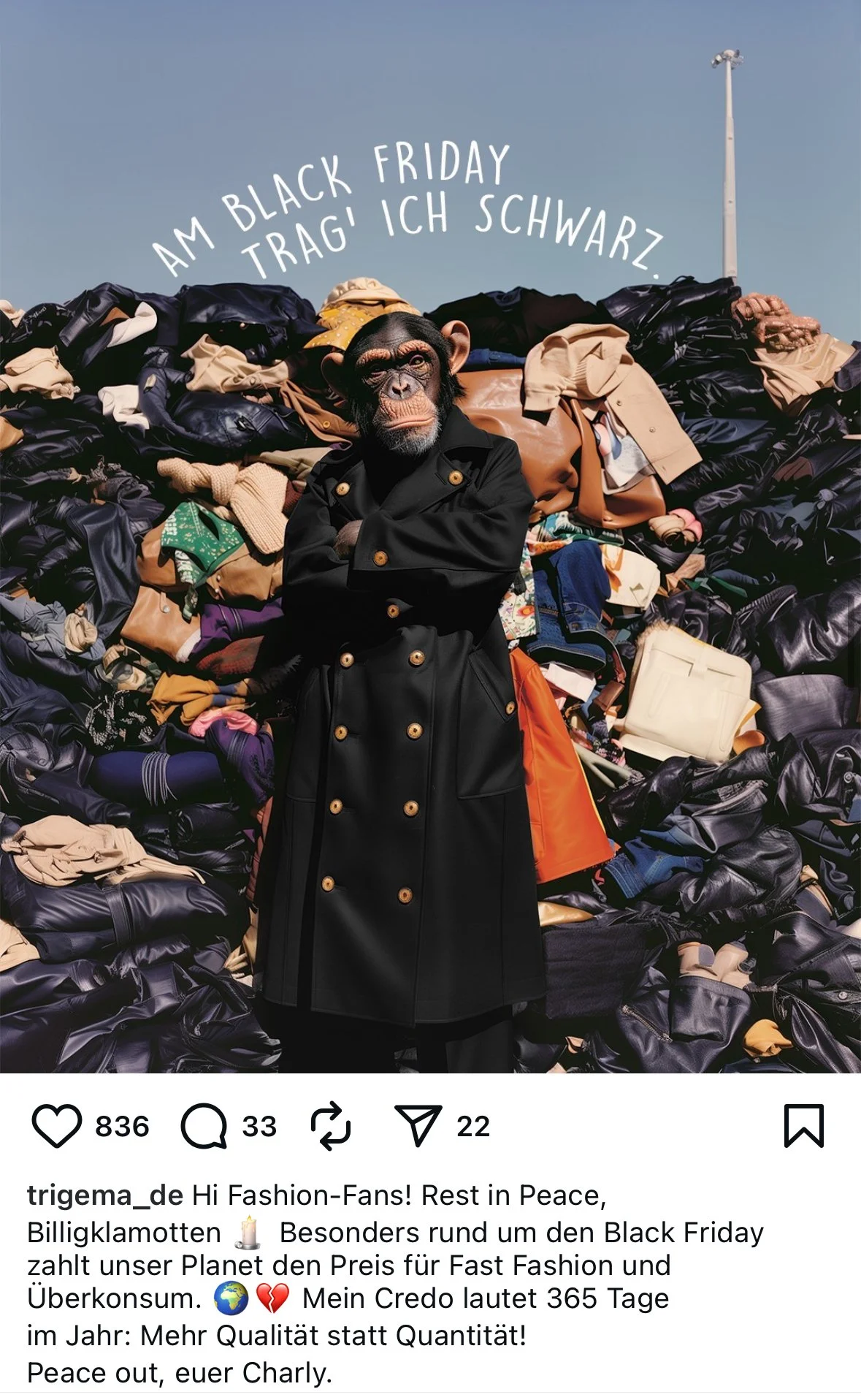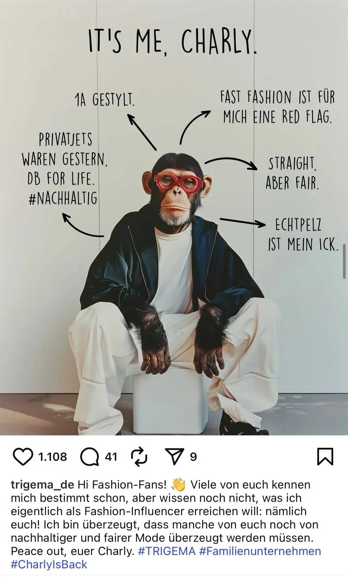 Die Kultmarke Trigema hauchte dem Affen Charly wieder Leben ein - in Form von KI! Die Traditionsmarke brauchte eine Social Media Strategie, um auch einer jüngeren Zielgruppe das ikonische Maskottchen vorzustellen. Coole, moderne Posts mit angepasster Sprache auf relevanten Kanälen schafften das. #CharlyIsBack